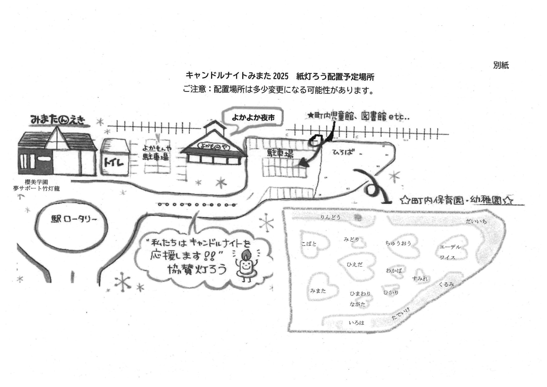 2025-12-18 キャンドルナイトみまた2025 日時:2025年12月20日(土)16時~20時30分 ※荒天の場合21日(日)に順延 開催場所:三股駅周辺及東側広場 内容:町内の保育園のこども達も製作に参加している、紙灯ろうなどを使ったキャンドルナイト ミマタレンジャー参上、よかよか夜市など ※周辺地図は添付にあるとおりです。 ※イベントなどの詳細については、えきにぎインスタ @mimata_n_ekinigi をご覧下さい。